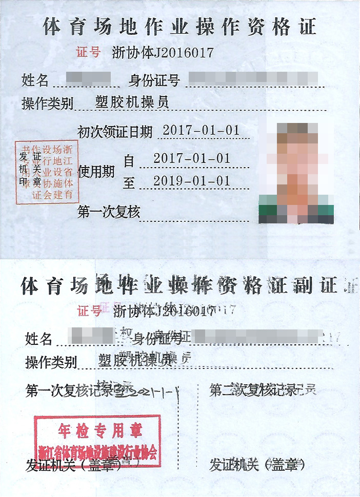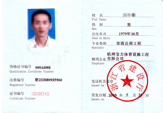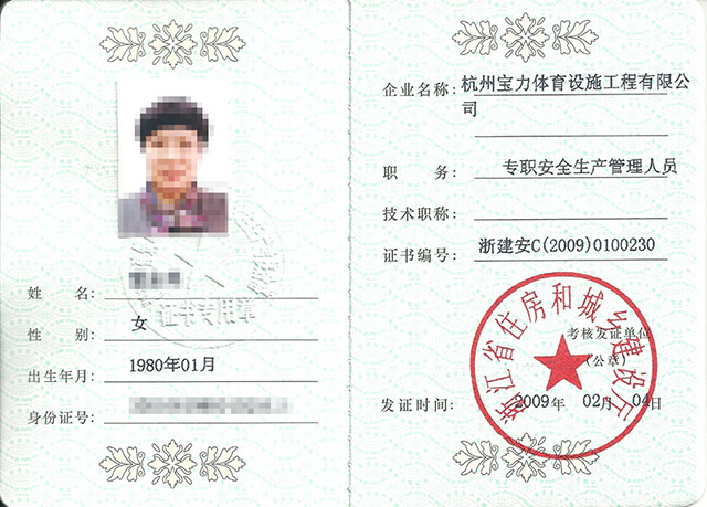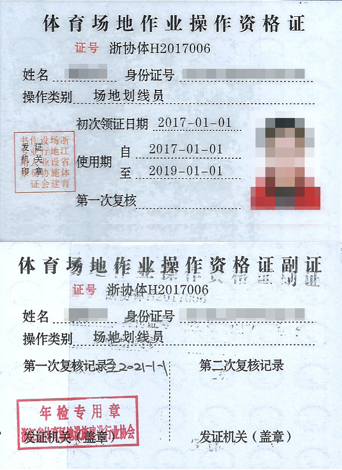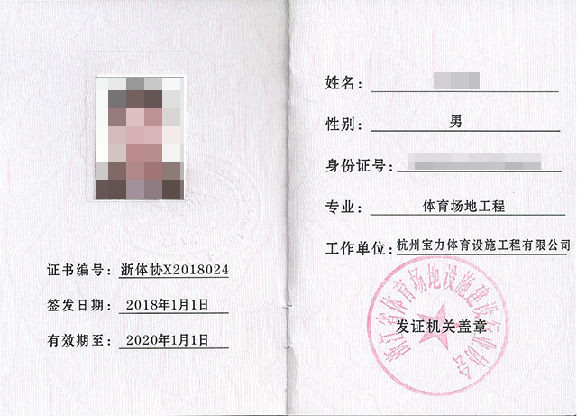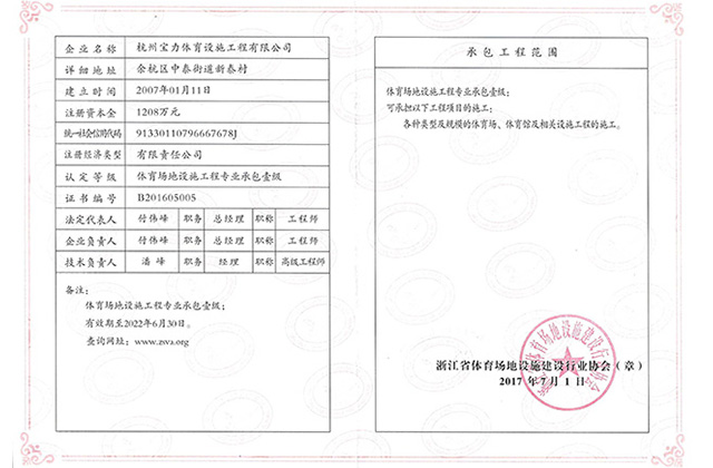 市政三級、房建三級、體育設施二級、體育設施行業(yè)協(xié)會能力認證一級,人員配備---建造師15個,具備施工員、安全員、質(zhì)量員、材料員、資料員、勞務員、標準員、機械員,中國田徑協(xié)會劃線師、體育場地設計員、塑膠機操員。