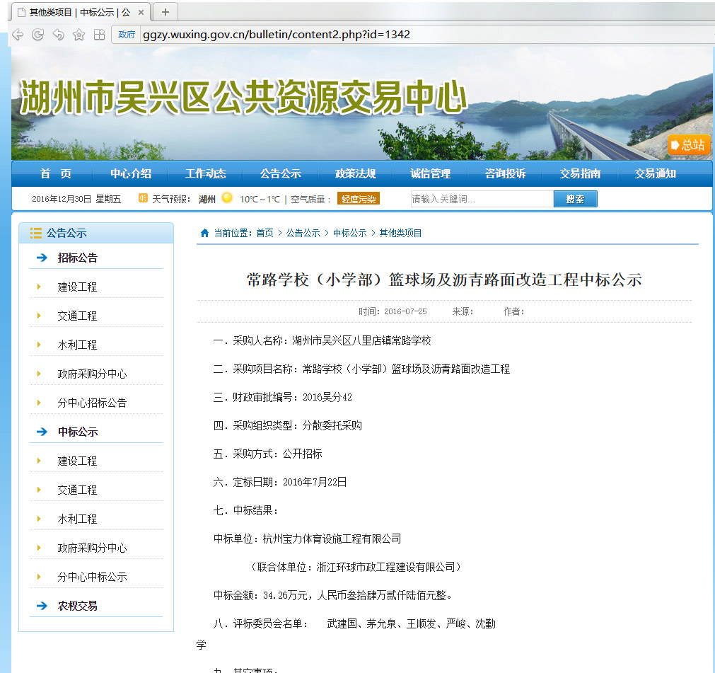 2016年12月23日中標縉云縣職業中等專業學校、 縉云縣章村小學籃球場硅PU塑膠面層等采購項目(第二次)