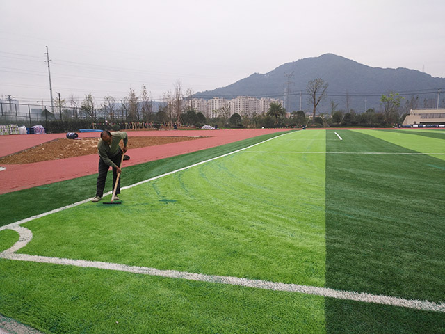 填充型人造草坪足球場的施工需遵循科學流程以確保質量。施工前需對場地進行全面勘察,清理雜物并做好基礎處理,確保地面平整、排水順暢。隨后,將人造草坪按設計展開并裁剪,使用專用膠水粘接接縫,確保平整牢固。接著,依次填充石英砂和橡膠顆粒,分次填充并梳理草絲,使填充材料均勻滲透至草根。施工完成后,需對草坪進行全面整理,檢查平整度、接縫牢固性等指標,確保符合運動要求。最后,組織驗收并交付使用,同時提供維護手冊,指導后續保養工作,以延長草坪使用壽命。