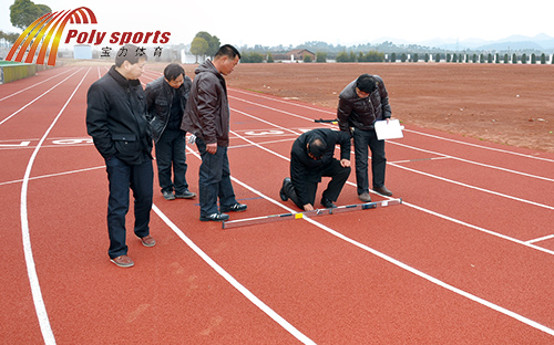 3、兩彎道的定位:彎道定位一般采用鋼尺丈量法。所選鋼尺必須經過專門鑒定機構的鑒定,因為每把鋼尺的拉伸系數以及在各溫度下熱脹冷縮的變化也是不一樣的。舉例而言:有一把新買的鋼尺 ,尺長為50M,經鑒定在20攝氏度,50N的外力作用下拉出來的距離為標準值X(拉),那么在30攝氏度的情況下會是怎樣呢?大家都知道熱脹冷縮這個道理,隨著外界溫度的不斷升高,尺子受溫度的影響也不斷的膨脹、變長,拉出來的距離也相對而言比實際變長了。也就是說你本想拉X(實)米的距離,結果你在30攝氏度的環境下以50N的拉力按尺面讀數拉了X(拉),值得注意的是你此時拉出來的X(拉)并不是你想要拉X(實)的距離,X(拉)大于X(實),這個變化是微小的,也就在幾毫米左右,但由此計算出來的跑道400M周長的誤差對允許4CM的正誤差的影響卻是非常之大,所以對溫度的調差(溫度改正數)及尺長的調差(尺長改正數)不得不引起塑膠跑道施工公司每位劃線員的高度重視。