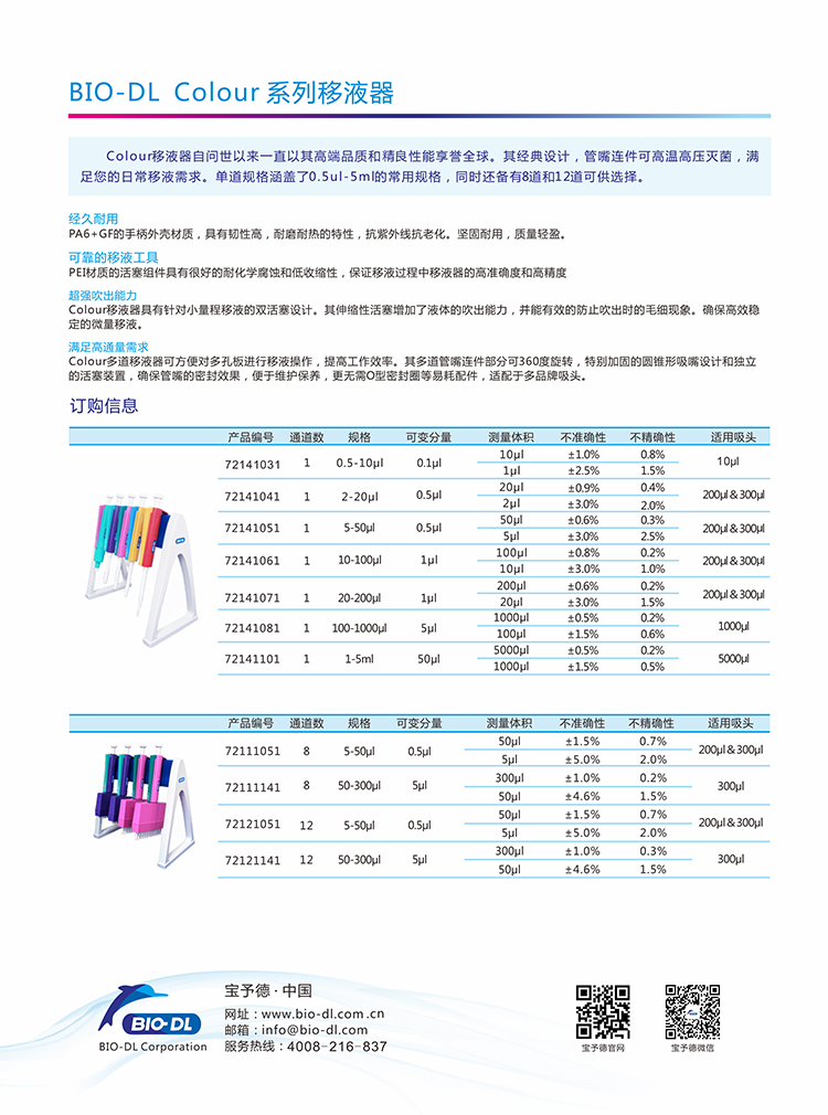Colour彩色移液器是更具性價比的經(jīng)久耐用的移液器,其下涵蓋單道微量可調(diào)移液器0.5-1000μl,單道可調(diào)大體積移液器1-5ml和多道微量可調(diào)移液器5-300μl。