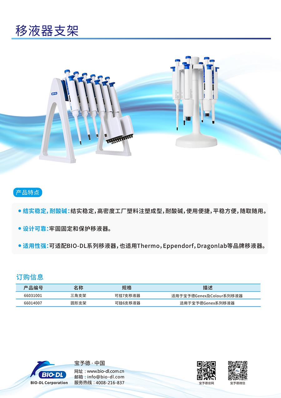 所有BIO-DL不同型號移液器都有適配的移液器支架:三角式傾斜支架和圓形支架。支架兼容各種其他品牌的移液器。